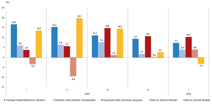 Yerleşik hanehalklarının nihai tüketim harcamaları 2024 yılının birinci çeyreğinde bir önceki yılın aynı çeyreğine göre zincirlenmiş hacim endeksi olarak %7,3 arttı. Devletin nihai tüketim harcamaları %3,9, gayrisafi sabit sermaye oluşumu ise %10,3 arttı.