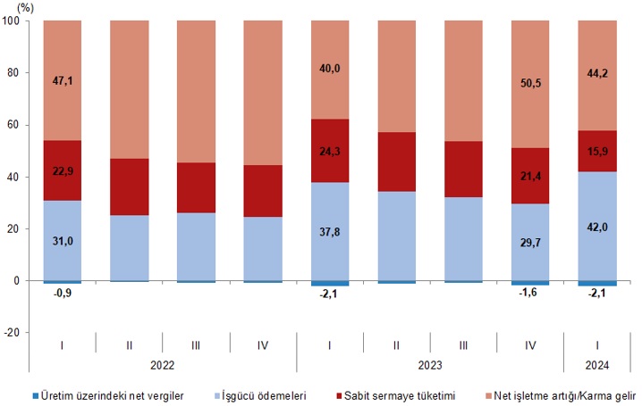 İşgücü ödemelerinin cari fiyatlarla Gayrisafi Katma Değer içerisindeki payı geçen yılın birinci çeyreğinde %37,8 iken, bu oran 2024 yılı birinci çeyreğinde %42,0 oldu. Net işletme artığı/karma gelirin payı ise geçen yılın birinci çeyreğinde %40,0 iken, 2024 yılı birinci çeyreğinde %44,2 oldu.