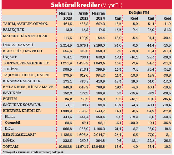 Son bir yılda kredi hacimleri reel olarak başlıca sektörlerden imalatta yüzde 15,9, ticarette yüzde 21,6, tarımda yüzde 11,9, inşaatta yüzde 28,6, turizmde yüzde 24,6, madencilikte yüzde 23,4, taşımacılık, depolama, haberleşmede yüzde 30,8, emlak komisyonculuğu, kiralama faaliyetlerinde yüzde 18,4, savunma sanayiinde yüzde 28,5, eğitimde yüzde 35,4, sağlıkta yüzde 18,4 daraldı. Bireysel kredi hacmi de yıllık bazda reel olarak yüzde 27,2 daralırken, kredi kartı borç bakiyesindeki reel büyümenin oranı da son bir yıl itibarıyla yüzde 3,1’e geriledi.