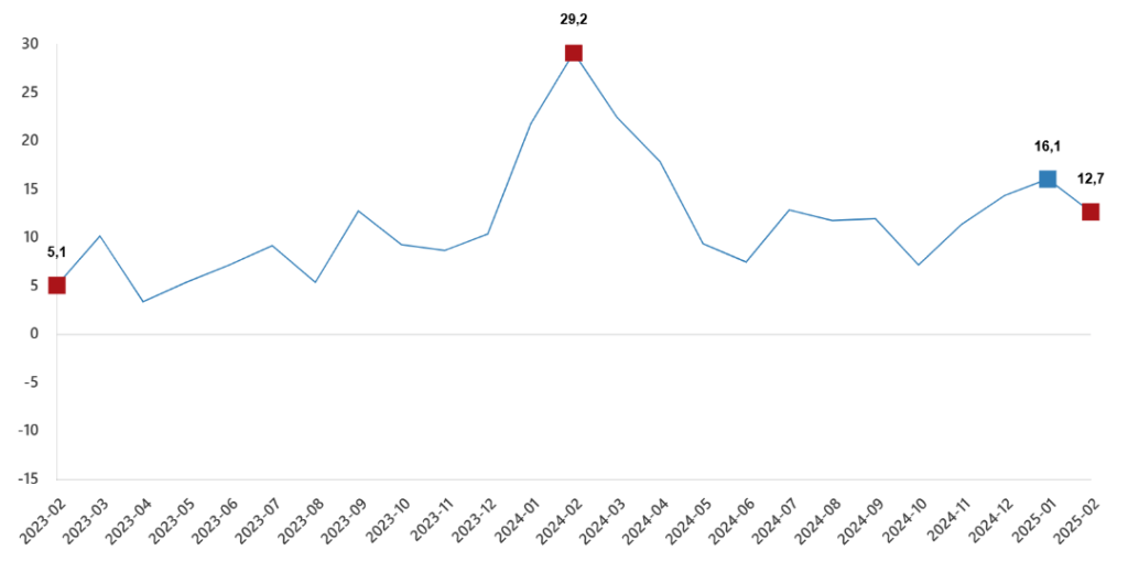 İnşaat üretim endeksi yıllık değişim oranları(%), Şubat 2025