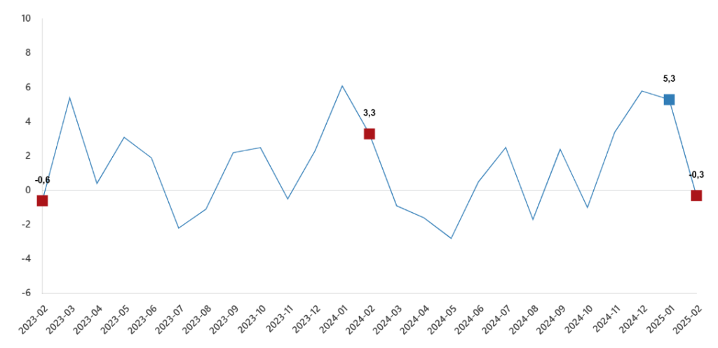 İnşaat üretim endeksi aylık değişim oranları(%), Şubat 2025