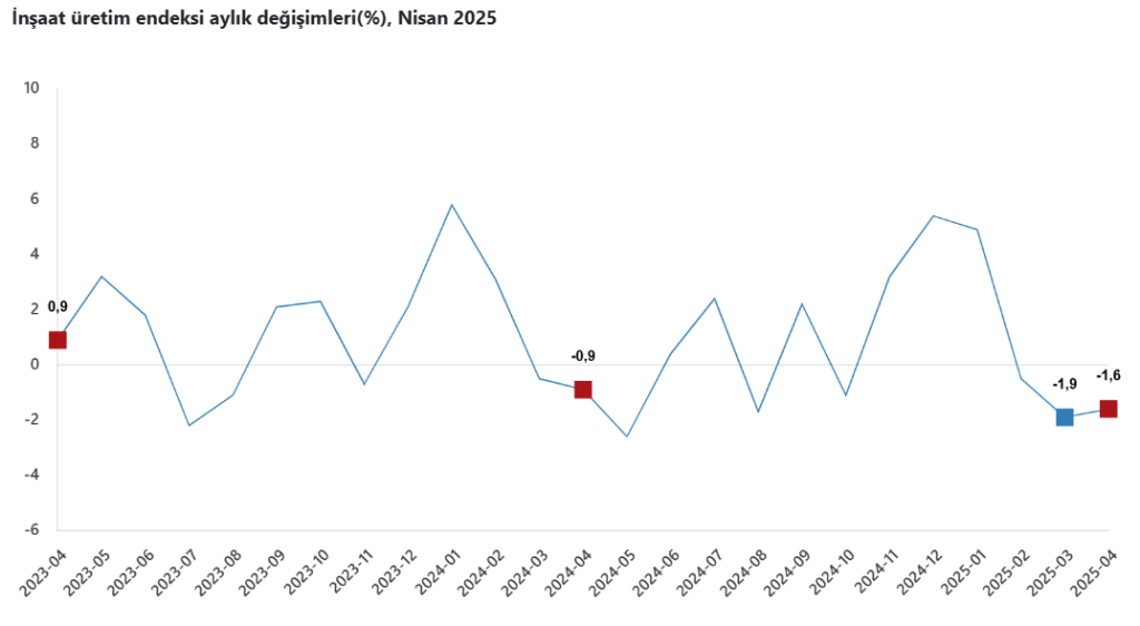 Türkiye İstatistik Kurumu (TÜİK) Nisan ayı itibarıyla İnşaat Üretim Endeksini açıkladı. Buna göre, inşaat üretimi aylıkta %1,6 azalmasına karşılık yıllık bazda %9,5 arttı.