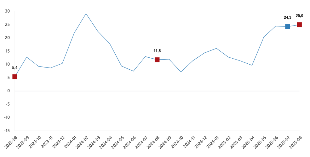 Türkiye İstatistik Kurumu (TÜİK) Ağustos 2025 itibarıyla İnşaat Üretim Endeksi verilerini açıkladı. Buna göre, inşaat üretimi yıllık %25,0 arttı.