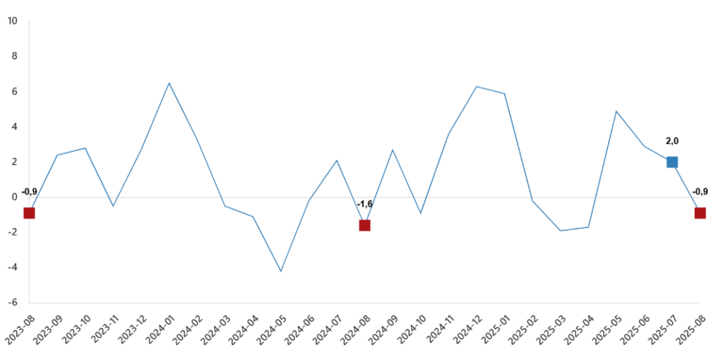 İnşaat üretim endeksi aylık değişimleri(%), Ağustos 2025