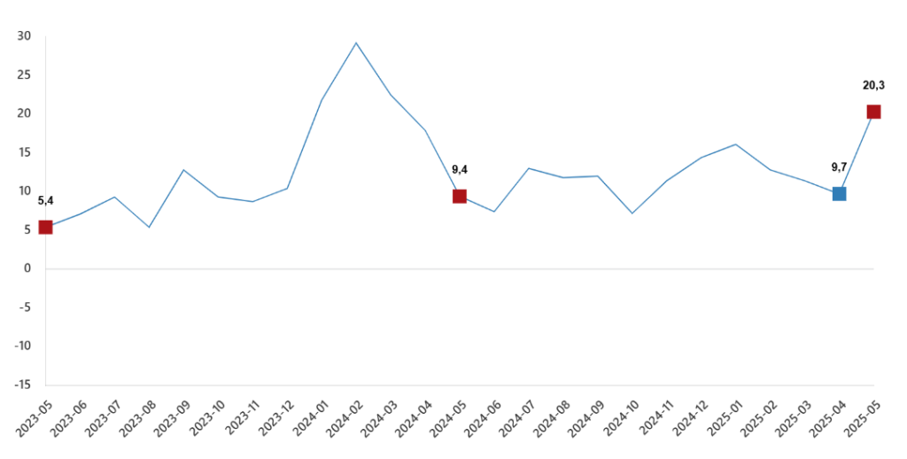 Türkiye İstatistik Kurumu (TÜİK) Mayıs 2025 itibarıyla İnşaat Üretim Endeksi verilerini açıkladı. Buna göre, İnşaat üretimi aylık %4.8, yıllık bazda ise %20.3 artış kaydetti.