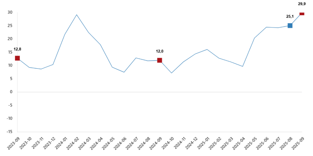 Türkiye İstatistik Kurumu (TÜİK) Eylül 2025 itibarıyla İnşaat Üretim Endeksi verilerini açıkladı. Buna göre, inşaat üretimi yıllık %29.9 arttı.