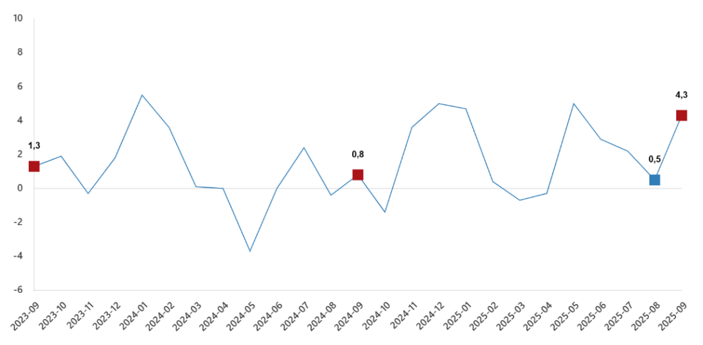 İnşaat üretim endeksi aylık değişimleri(%), Eylül 2025