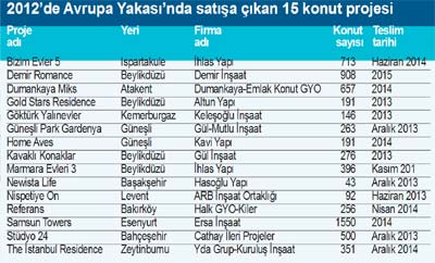 Kentsel dönüşüm, 2B ve mütekabiliyet yasalarının çıkmasıyla birlikte son yılların en hareketli günlerini geçiren gayrimenkul sektörü, 2011yılında Avrupa’da yaşanan krize rağmen ciddi bir büyümeye sahne oldu. 2012’ye de İstanbul’un her yerinde hızla yükselen yeni konut projeleriyle giriş yapan sektör, geçen yıl gerçekleştirdiği büyümeyi bu yıl da sürdürecek gibi görünüyor. Yılbaşından bu yana İstanbul’un iki yakasında birden birçok projenin lansmanı yapıldı bile. Yılsonuna kadar ise bunlara yenilerinin eklenmesi bekleniyor. İşte 2012 yılında Avrupa yakasında satışa çıkan konut projeleri…