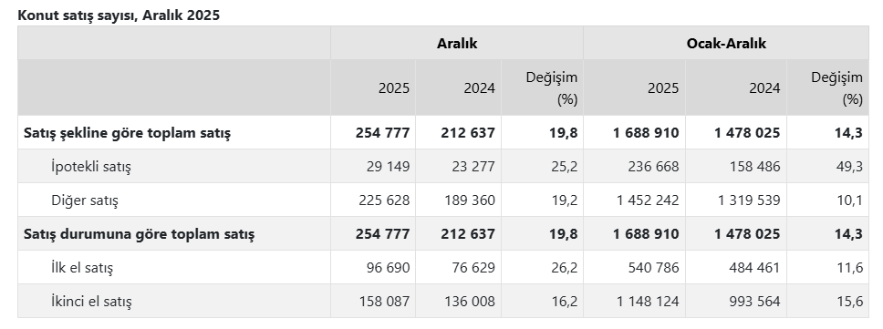 Türkiye genelinde diğer konut satışları Aralık ayında bir önceki yılın aynı ayına göre %19,2 oranında artarak 225 bin 628 oldu. 2025 yılında gerçekleşen diğer konut satışları ise bir önceki yıla göre %10,1 oranında artarak 1 milyon 452 bin 242 oldu.