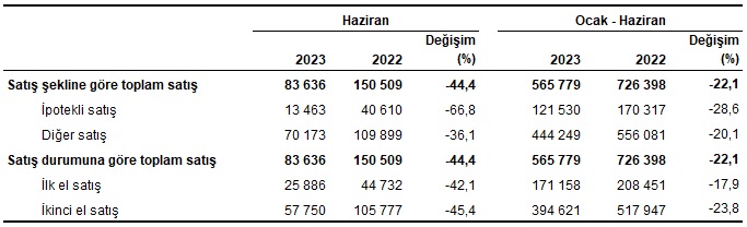 Türkiye İstatistik Kurumu (TÜİK), Haziran 2023 Konut Satış İstatistiklerini açıkladı. Buna göre haziran ayında konut satışları bir önceki yılın aynı ayına göre %44.4 azalarak 83 bin 636 oldu.