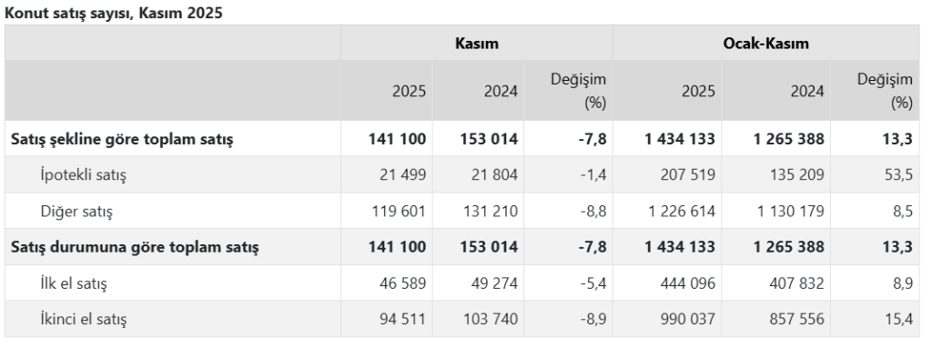 Türkiye İstatistik Kurumu (TÜİK) Kasım 2025 itibarıyla konut satış istatistiklerini açıkladı. Buna göre, geçen yılın aynı dönemine göre yüzde 7.8 azalan konut satış adetleri 141 bin 100 olarak kayıtlara geçti.