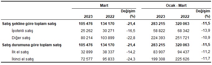 Türkiye İstatistik Kurumu (TÜİK), Mart 2023 Konut Satış İstatistiklerini açıkladı. Buna göre mart ayında konut satışları bir önceki yılın aynı ayına göre %21.4 azalarak 105 bin 476 oldu. Toplam konut satışları içinde ipotekli konut satışlarının oranı yüzde 24 olarak kayıtlara geçti.