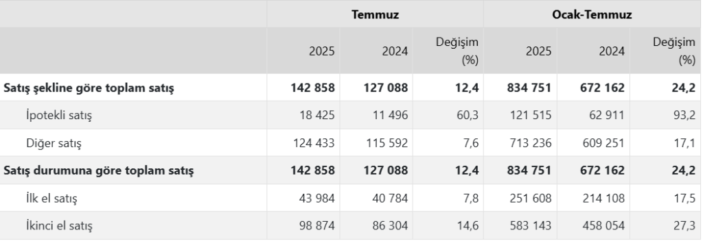 Türkiye İstatistik Kurumu (TÜİK) Temmuz 2025 itibarıyla Konut Satış İstatistiklerini açıkladı. Buna göre, geçen yılın aynı dönemine göre yüzde 12.4 artan konut satışları temmuzda 142 bin 858 adet olarak gerçekleşti.