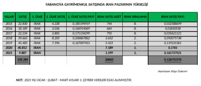 2015 yılından itibaren Son 6 yıl (75 ayın) TÜIK verileri değerlendirildiğinde toplam 158.286 adetlik yabancıya gayrimenkul satışında %12.6’ lık toplam 20.063 adet ile İRAN pazarına yapılan gayrimenkul satışlarının önemli bir paya sahip olduğunu gözlemliyoruz.