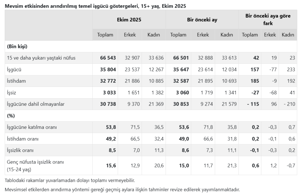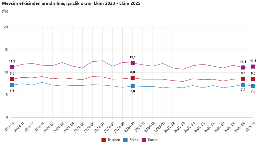 Türkiye İstatistik Kurumu (TÜİK) Ekim 2025 itibarıyla İşgücü İstatistiklerini açıkladı. Buna göre, mevsim etkisinden arındırılmış işsizlik oranı %8,5 seviyesinde gerçekleşti.