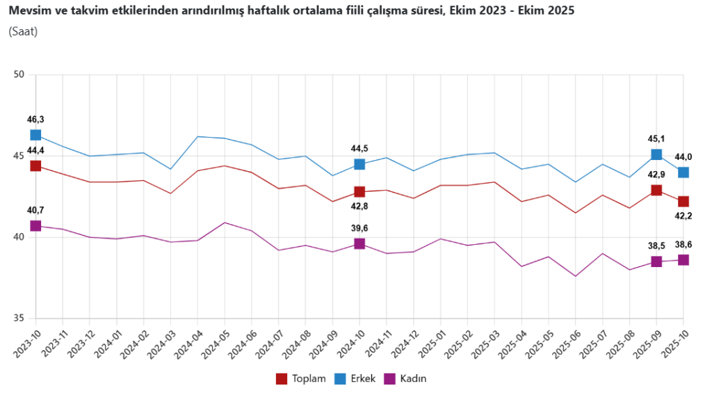 İstihdam edilenlerden referans döneminde işbaşında olanların, mevsim ve takvim etkilerinden arındırılmış haftalık ortalama fiili çalışma süresi 2025 yılı Ekim ayında bir önceki aya göre 0,7 saat azalarak 42,2 saat olarak gerçekleşti.
