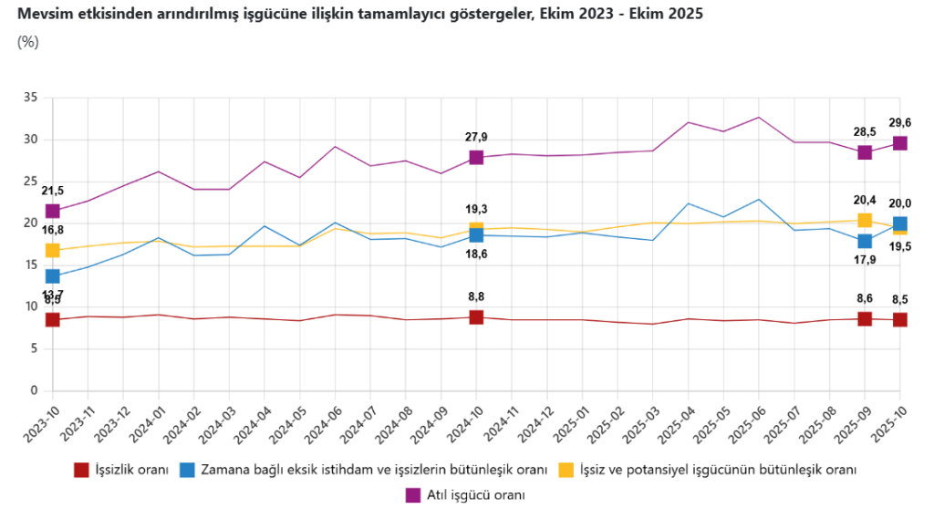Zamana bağlı eksik istihdam, potansiyel işgücü ve işsizlerden oluşan atıl işgücü oranı 2025 yılı Ekim ayında bir önceki aya göre 1,1 puan artarak %29,6 oldu. Zamana bağlı eksik istihdam ve işsizlerin bütünleşik oranı %20,0 iken işsiz ve potansiyel işgücünün bütünleşik oranı %19,5 olarak tahmin edildi.