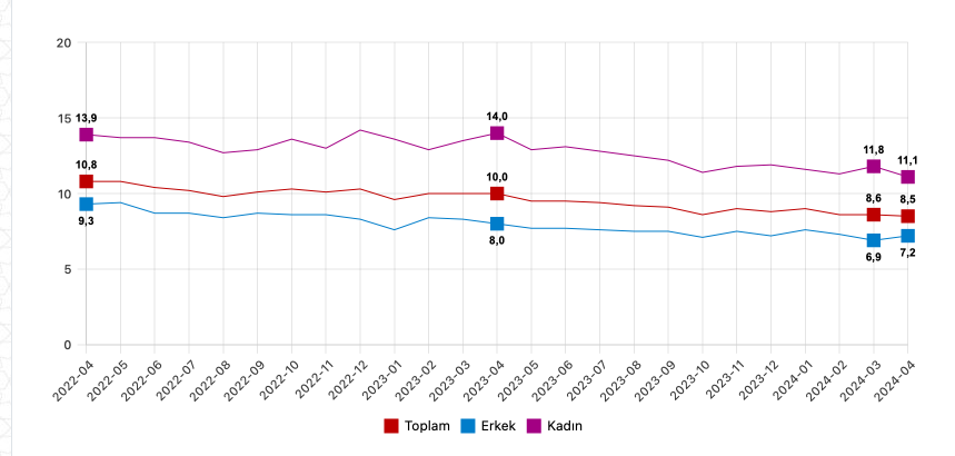 Hanehalkı İşgücü Araştırması sonuçlarına göre; 15 ve daha yukarı yaştaki kişilerde işsiz sayısı 2024 yılı Nisan ayında bir önceki aya göre 18 bin kişi azalarak 3 milyon 42 bin kişi oldu. İşsizlik oranı ise 0,1 puan azalarak %8,5 seviyesinde gerçekleşti. İşsizlik oranı erkeklerde %7,2 iken kadınlarda %11,1 olarak tahmin edildi.