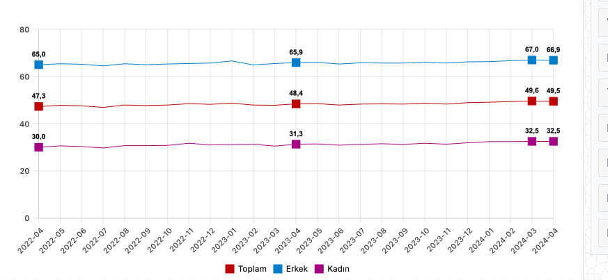 İşgücü 2024 yılı Nisan ayında bir önceki aya göre 18 bin kişi azalarak 35 milyon 661 bin kişi, işgücüne katılma oranı ise aynı seviyede kalarak %54,2 olarak gerçekleşti. İşgücüne katılma oranı erkeklerde %72,1 iken kadınlarda %36,6 oldu.