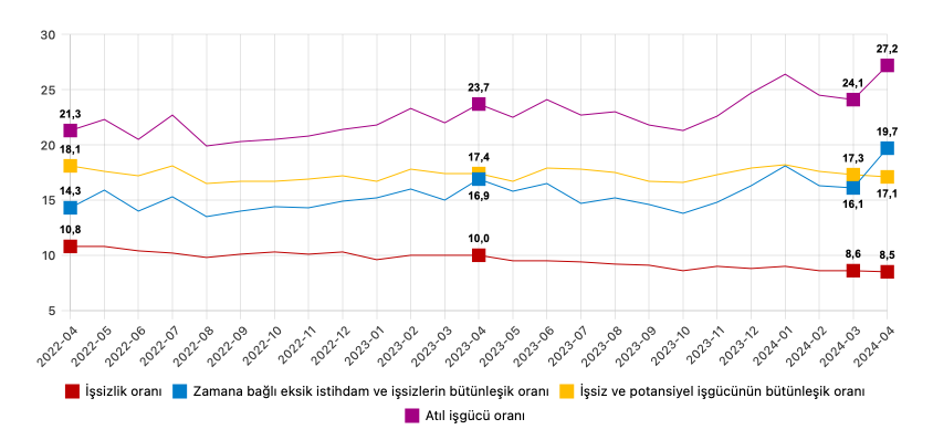 Zamana bağlı eksik istihdam, potansiyel işgücü ve işsizlerden oluşan atıl işgücü oranı 2024 yılı Nisan ayında bir önceki aya göre 3,1 puan artarak %27,2 oldu. Zamana bağlı eksik istihdam ve işsizlerin bütünleşik oranı %19,7 iken işsiz ve potansiyel işgücünün bütünleşik oranı %17,1 olarak tahmin edildi.
