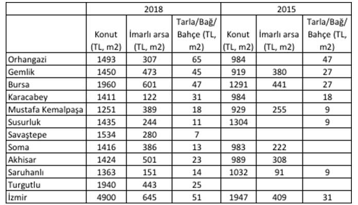 Otoyolun geçtiği il ve ilçelerdeki konut, imarlı arsa ve tarla fiyatlarında son 3 yılda yaşanan değişimler aşağıdaki tabloda şöyle özetlendi: