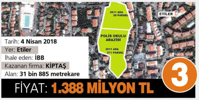 Etiler Polis Meslek Yüksekokulu’nun 31 bin 885 metrekarelik arazisi 1 milyar 388 milyon 520 bin TL’ye İBB şirketlerinden KİPTAŞ’ın oldu. Söz konusu arazinin tahmini bedeli 1 milyar 356 milyon 600 bin lira olarak belirlenmişti.