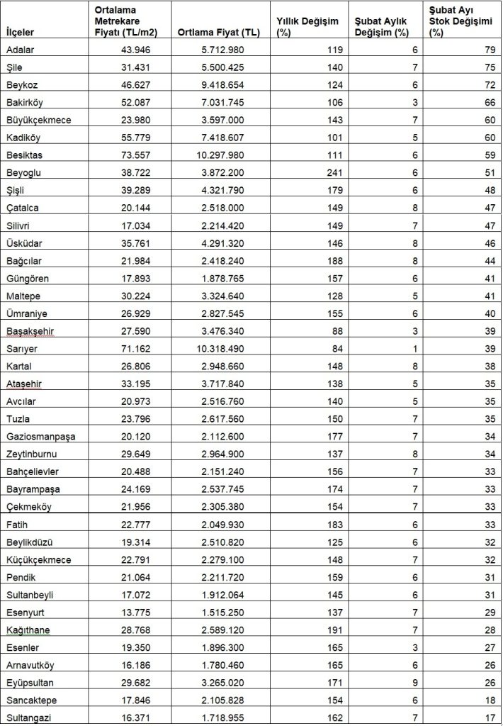 Endeksa Şubat ayı verilerine göre, satılmayı bekleyen konutların en fazla artış gösterdiği ilçeler Adalar, Şile, Beykoz, Bakırköy, Büyükçekmece, Kadıköy ve Beşiktaş oldu. Adalar’da satılık konut stoku %79 artış gösterirken, yıllık değer artışı %119, Şubat ayı değer artışı %6 oldu. Adalar’da konutların ortalama metrekare fiyatı 43 bin 946 TL, ortalama konut fiyatı 5 milyon 712 bin 980 TL olarak gerçekleşti. Şubat ayında konut fiyatlarının %7 artış gösterdiği Şile’de satılık konut stoku %75 artış gösterdi, ortalama metrekare satış fiyatı 31 bin 431 TL, ortalama konut fiyatı 5 milyon 500 bin 425 TL oldu. Beykoz’da ise Şubat ayında satılık konut stoku %72 artış gösterdi. Şubat ayı değer artışının %6 olduğu Beykoz’da konutların ortalama metrekare satış fiyatı 46 bin 627 TL, ortalama konut fiyatı ise 9 milyon 418 bin 654 TL oldu. Bakırköy’de Şubat ayında satılık konut stoku %66 arttı. Şubat ayı değer artışının %3 olduğu Bakırköy’de konutların ortalama metrekare satış fiyatı 52 bin 087 TL, ortalama konut fiyatı ise 7 milyon 031 bin 745 TL olarak gerçekleşti.