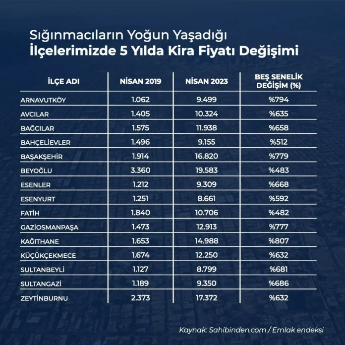 Türkiye’nin en büyük şehri İstanbul’da sığınmacıların yoğun olarak yaşadığı ilçelerde 2019 ile 2023 yılları arasını kapsayan beş yıllık dönemde yaşanan kira değişimi karşılaştırıldı.