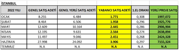 Yabancıların projeden 1. El’ de satış tercihi ile net proje satışlarını kıyasladığımızda; 2022 yılında İstanbul’ da projelerde haziran ayına kadar “1-yerli + 1-yabancı“ satışı; haziran ayında “2-yerli+1-yabancı“ satışı gerçekleştiğini gözlemliyoruz.