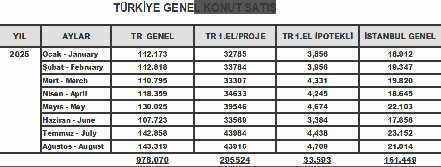 İSTANBUL İLİNDE, 2025 Yılının ilk sekiz ayında Ocak – Ağustos dönemlerinde toplam 161.449 adet konut satışı gerçekleşmiştir.