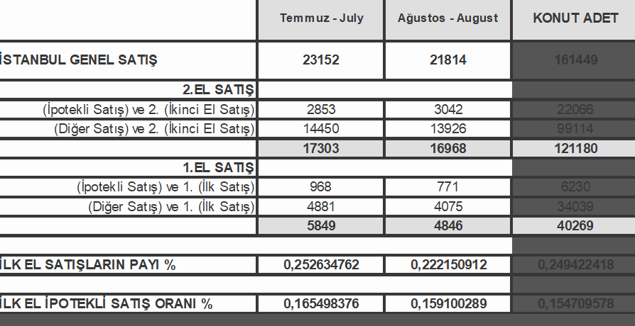 Türkiye geneli, 1.El konut satışlarının genel satışlar içindeki payının %30’ lar seviyesinden yükselişe geçebilmesi hedeflenirken, İstanbul’ un 8 ay genelinde Türkiye ortalamasının altında %24,9’larde kalması ve Ağustos ayında %22,2’ lere gerilemesi üzerinde düşünülmelidir.