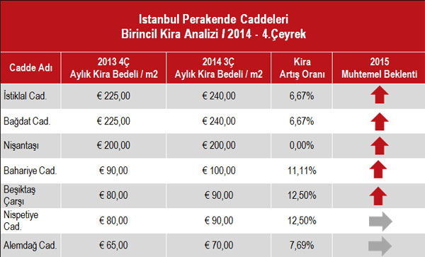 Bunun yanı sıra, rapora göre 2015 yılında İstiklal, Bağdat,Bahariye ve Beşiktaş Çarşı’da kira bedellerindeki yükseliş trendi sürecek. 2015’te Alemdağ ve Nispetiye Caddeleri’nde fiyatların mevcut seviyelerini muhafaza edeceği öngörülüyor.