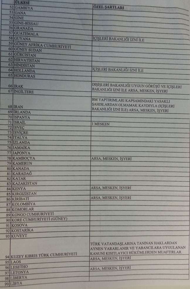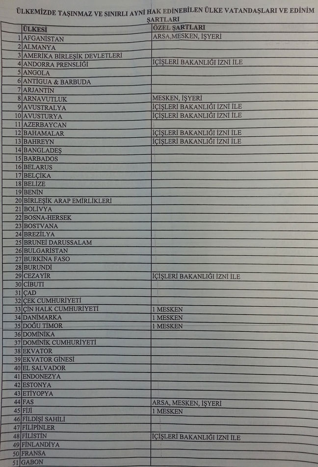Mayıs ayında TBMM'den geçen mütekabiliyet yasasının uygulama esasları, iki aydır Bakanlar Kurulu'nun onaylayacağı listeyi bekliyordu. Yenilenen listeye göre, halen 53 olan Türkiye'den şartsız gayrimenkul edinme hakkına sahip ülke sayısı 129'a çıkarken, 52 ülkeye özel sınırlamalar ve izin şartları getirildi. Suriye, Ermenistan, Kuzey Kore, Küba, Nijerya ve Yemen 181 ülke arasında yer almadı. Bu ülke vatandaşları Türkiye'den gayrimenkul satın alamayacak. Yabancılara gayrimenkul satışlarında patlama yaratması beklenen düzenleme ile Çin, Danimarka, Doğu Timor, Fiji ve ilişkilerimizin kopma noktasında olduğu İsrail için bir mesken sınırlaması getirildi. Ürdün'e ise 2 mesken ve 1 işyerinden fazla gayrimenkul satışı yapılamayacak.
