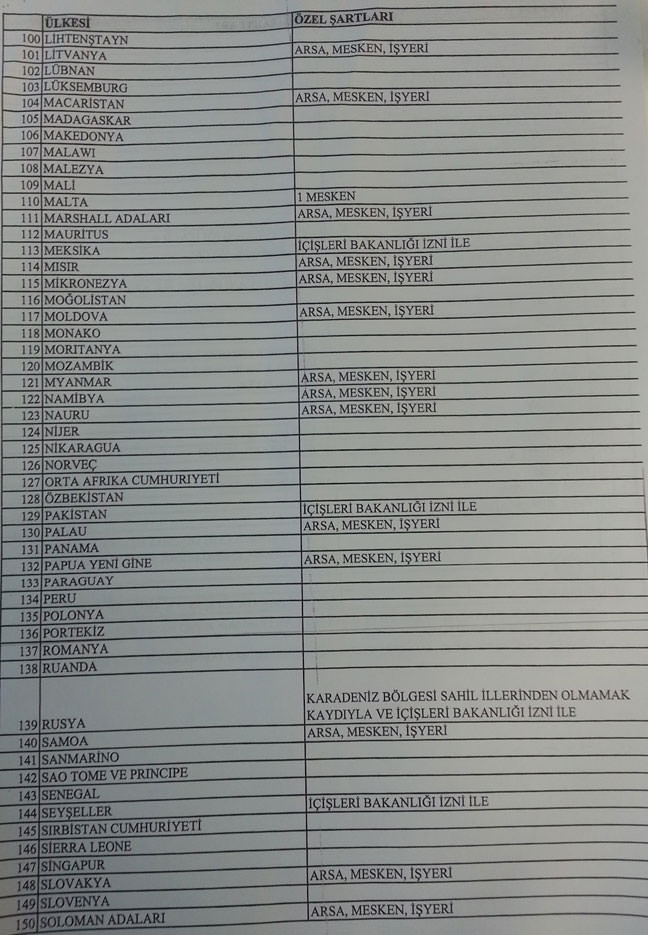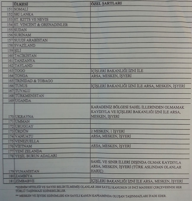 Kararnamede 31 ülkeye sadece arsa, mesken ve işyeri kısıtlaması getirildi. Bu kriterlere göre Fas, Mısır, Letonya, Afganistan ve bazı küçük Afrika ülkelerinin de aralarında olduğu yerlerin vatandaşları Türkiye'de tarım arazisi, bağ-bahçe sahibi olamayacak. Arnavutluk vatandaşları da konut ve işyeri haricinde arazi alamayacak.
