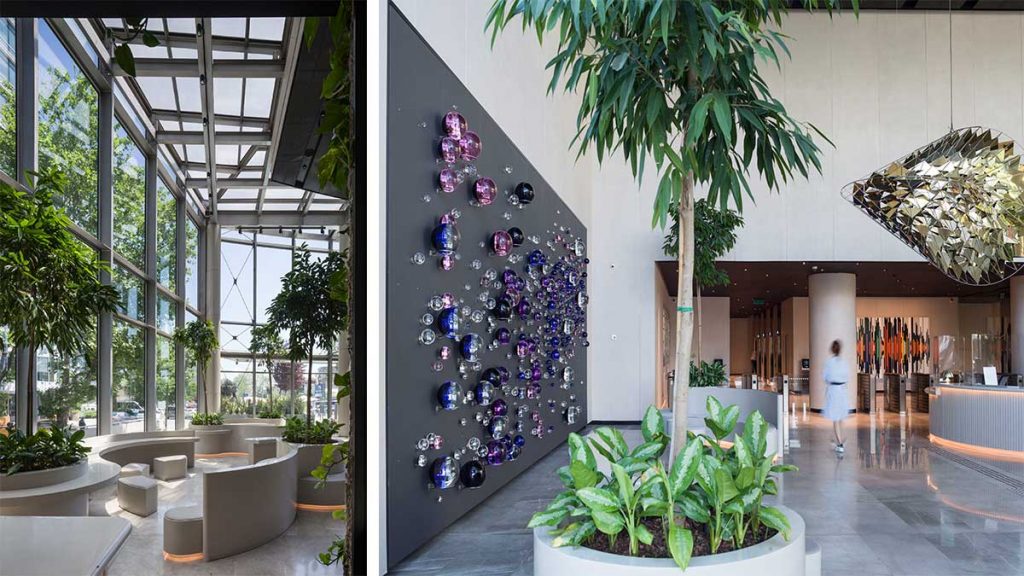 Öte yandan, lobi alanında konumlandırılan ve doğa ile etkileşimi mümkün kılan dikey bahçe, iç mekanda doğal unsurlarla doğrudan temas sağlarken, insan ve doğa arasındaki bağı artırmanın yanı sıra havayı temizleyen bitki kombinasyonu ile doğal bir hava filtreleme sistemi özelliğine de sahip. Dikey bahçede Pothos sarmaşığı bitkileri topraksız tarım uygulamasıyla yaşarken, oturma gruplarının merkezinde de Benjamin Kavuçuğu ağaçları ve Aglaonema bitkileri bulunuyor.