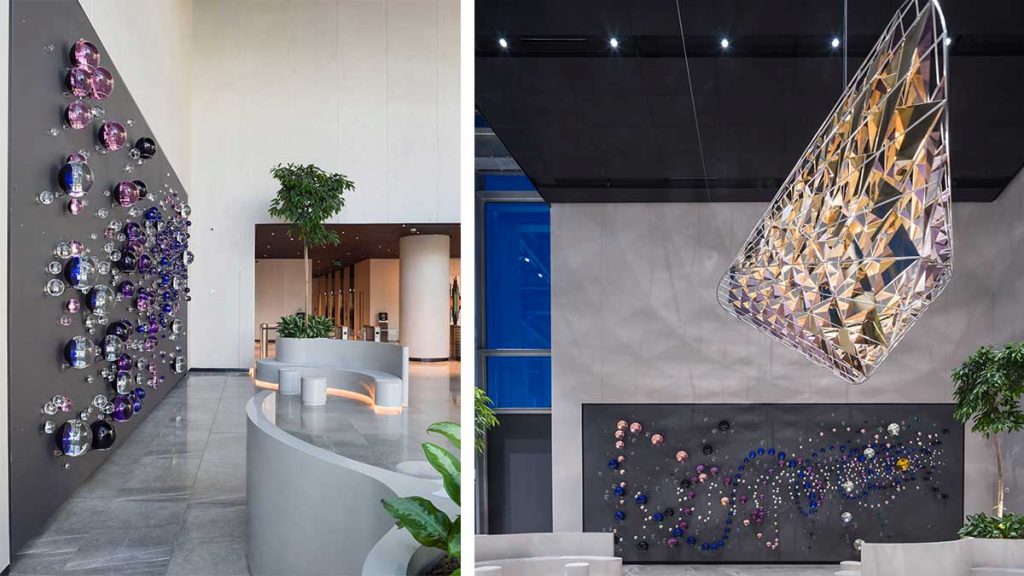 Lobide konumlandırılan üç sanat eserinden ikisi, ışık, su, sıcaklık gibi değişkenleri kullanarak izleyici deneyimini öne çıkardığı çalışmalarıyla sanat dünyasının son yıllardaki ses getiren isimlerinden Olafur Eliasson’a ait. Guggenheim Bilbao, Tokyo Modern Sanat Müzesi, Versailles Sarayı gibi müzelerde kişisel sergiler gerçekleştiren Olafur Eliasson’un Kanyon Ofis’te yerleştirilen eserleri, “Birçok geleceğin varışı”ve “Kaybolmakta olan zamanın şekli” isimlerini taşıyor.Odak alanları arasında doğa ve küresel ısınma olan Eliasson’un, MoMA, Tate Modern, Pompidou Sanat Müzesi, San Francisco Modern Sanat Müzesi gibi kurumların koleksiyonlarında eserleri yer alıyor.