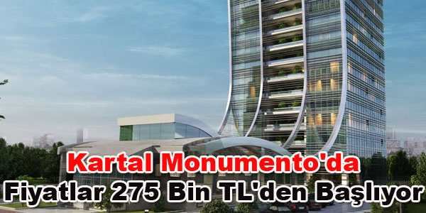 1+0 ve 1+1'lerden oluşan Kartal Monumento'da fiyatlar 275 bin liradan başlıyor. Projede 42 daire, 90 home ofis ve 4 ticari ünite yer alıyor. Ev ve ofis almak isteyenlere konut kredisi imkanıda sunuluyor Kuzeyyıldızı İnşaat tarafından Kartal'da inşa edilen Monumento 5 bin metrekare arsa içinde yükseliyor. Teslimler Nisan 2014’te yapılacak. 15 katlıtek blok olarak tasarlanan projede 69 metrekarelik home ofisler 275 bin liradan, 99 metrekarelik 1+1 rezidanslar 461 binliradan başlangıç gösteren fiyatlarla alıcılara