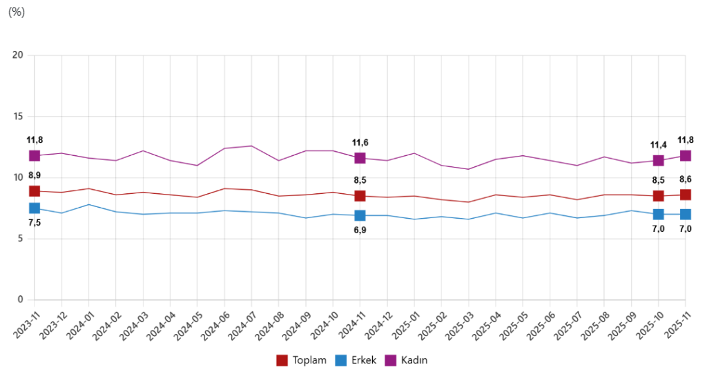 Türkiye İstatistik Kurumu (TÜİK) Kasım 2025 itibarıyla İşgücü İstatistiklerini açıkladı. Buna göre, mevsim etkisinden arındırılmış işsizlik oranı %8.6 seviyesinde gerçekleşti.