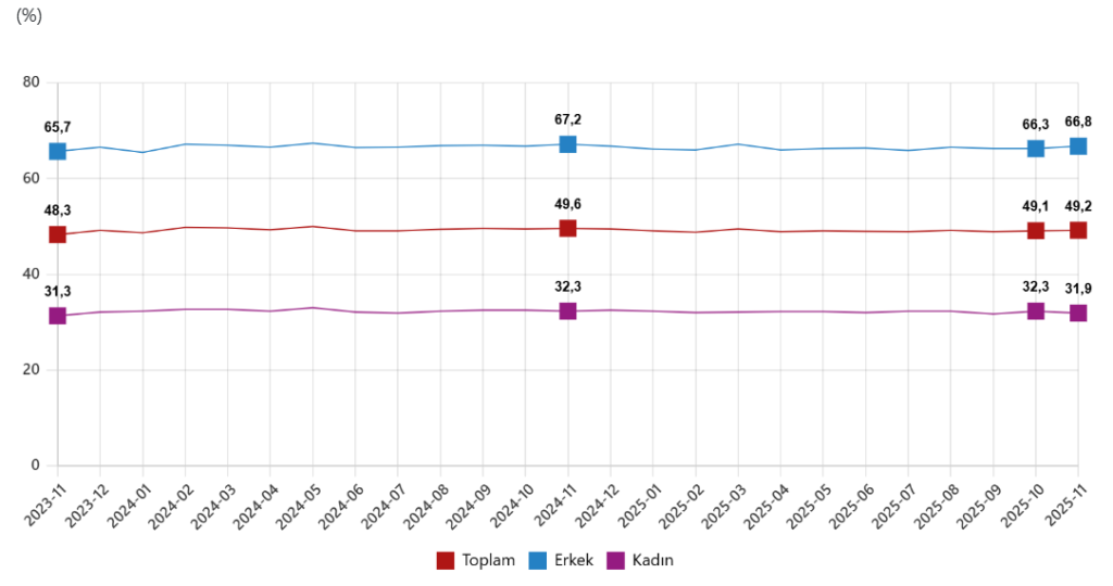 İstihdam edilenlerin sayısı 2025 yılı Kasım ayında bir önceki aya göre 75 bin kişi artarak 32 milyon 737 bin kişi, istihdam oranı ise 0,1 puan artarak %49,2 oldu. Bu oran erkeklerde %66,8 iken kadınlarda %31,9 olarak gerçekleşti.