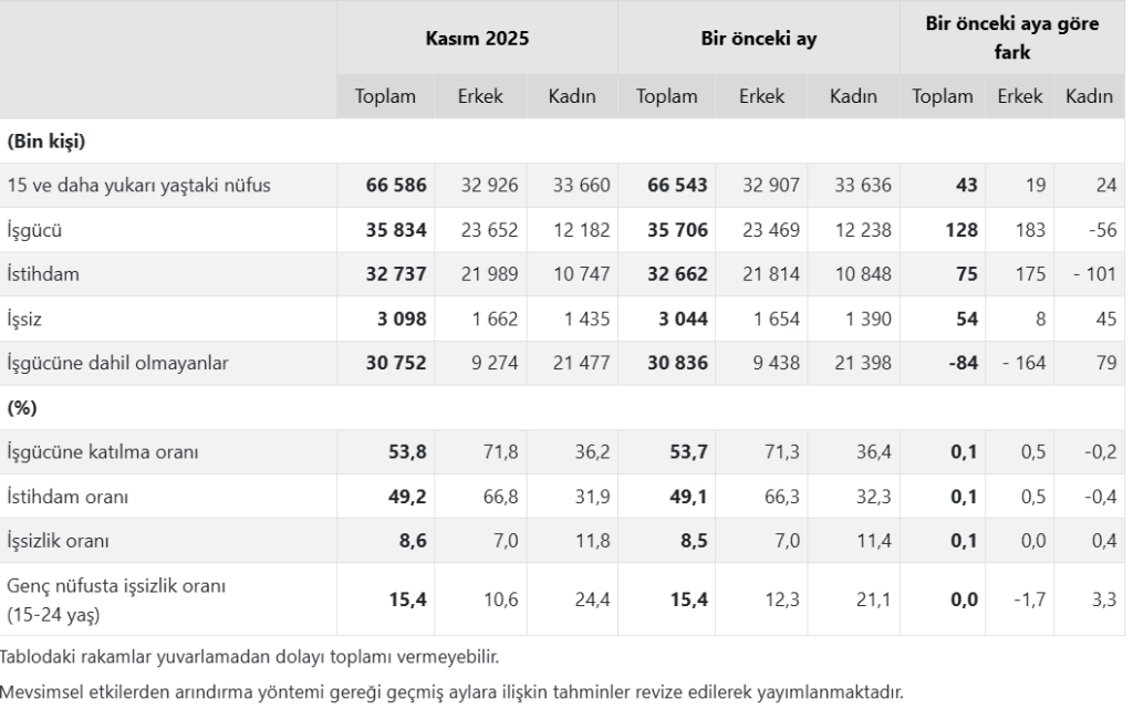 Hanehalkı İşgücü Araştırması sonuçlarına göre; 15 ve daha yukarı yaştaki kişilerde işsiz sayısı 2025 yılı Kasım ayında bir önceki aya göre 54 bin kişi artarak 3 milyon 98 bin kişi oldu. İşsizlik oranı ise 0,1 puan artarak %8,6 seviyesinde gerçekleşti. İşsizlik oranı erkeklerde %7,0 iken kadınlarda %11,8 olarak tahmin edildi.