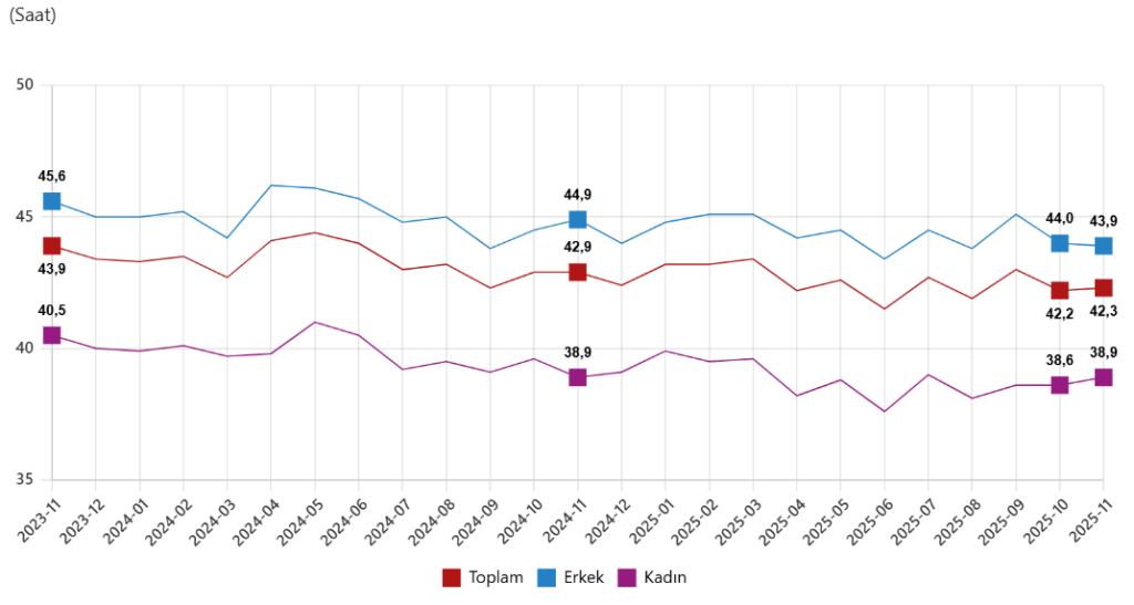 İstihdam edilenlerden referans döneminde işbaşında olanların, mevsim ve takvim etkilerinden arındırılmış haftalık ortalama fiili çalışma süresi 2025 yılı Kasım ayında bir önceki aya göre 0,1 saat artarak 42,3 saat olarak gerçekleşti.
