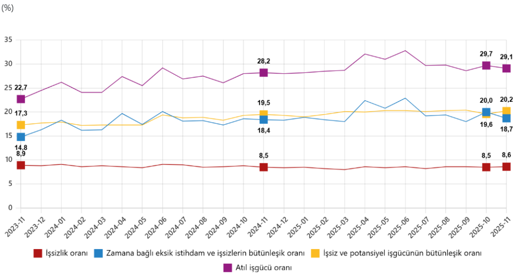 Zamana bağlı eksik istihdam, potansiyel işgücü ve işsizlerden oluşan atıl işgücü oranı 2025 yılı Kasım ayında bir önceki aya göre 0,6 puan azalarak %29,1 oldu. Zamana bağlı eksik istihdam ve işsizlerin bütünleşik oranı %18,7 iken işsiz ve potansiyel işgücünün bütünleşik oranı %20,2 olarak tahmin edildi.