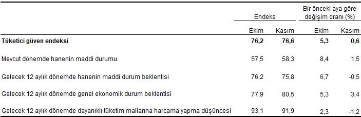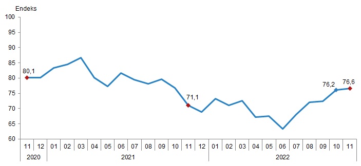 Türkiye İstatistik Kurumu (TUİK) ve Türkiye Cumhuriyet Merkez Bankası (TCMB) işbirliğiyle hazırlanan Tüketici Güven Endeksi Kasım 2022 verileri açıklandı. Buna göre, Kasım ayında bir önceki aya göre %0.6 oranında arttı; Ekim ayında 76.2 olan endeks, Kasım ayında 76.6 oldu.