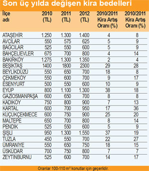 Reidin.com’un verilerine göre 2010-2012 yıllarını değerlendirmesinde kiralarda en çok artış gösteren ilçe Eyüp. Kiraların son iki yılda yüzde 42 oranında arttığı ilçeyi yüzde 38 ile Kartal, yüzde 36 ile Beşiktaş izliyor. Diğer semtlerde enflasyon oranına paralel bir artış gösteren kira bedellerinde en göze çarpan yükselmeler; Sancaktepe, Küçükçekmece, Tuzla, Ümraniye Beylikdüzü ve Ataşehir’de görülüyor. Verileri değerlendiren Dinçer, “Artış gösteren ilçeler yerleşim oranının hızla arttığı bölgeler. Ayrıca Şişli’de adliye binasının ve lüks projelerin pozitif etkisi, yine şehir merkezi olan Beşiktaş’a olan talep, Kartal’daki metro hattının açılmasına az bir süre kalmasının semte pozitif etkisi ve Zeytinburnu’ndaki kentsel dönüşüm projeleri bu semtlerdeki kira bedellerinin yükselmesine neden olmuştur” diye ifade etti.