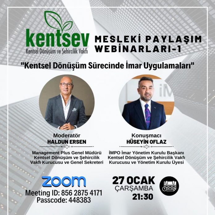 Kentsel Dönüşüm ve Şehircilik Vakfı (KENTSEV) tarafından düzenlenen mesleki eğitim etkinliklerinin ilki “Kentsel Dönüşüm Sürecinde İmar Uygulamaları” temasıyla zoom üzerinden dijital olarak 27 Ocak çarşamba günü gerçekleştirilecek.