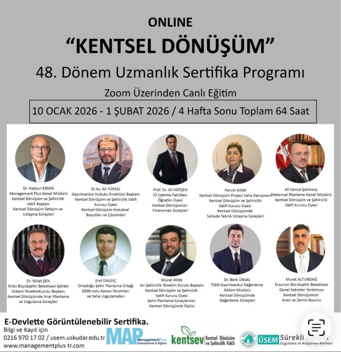 Management Plus, Kentsel Dönüşüm ve Şehircilik Vakfı ve Üsküdar Üniversitesi SEM işbirliği ile 12 yıldır devam eden “Kentsel Dönüşüm Uzmanlık Sertifika Programı” yeni dönem kayıtları başladı.