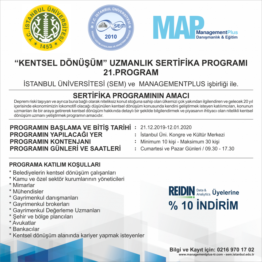 İstanbul Üniversitesi (SEM) ve Management Plus iş birliği ile gerçekleştirilen Kentsel Dönüşüm Uzmanlık Sertifikası Programının 21.’si için kayıtlar başladı.