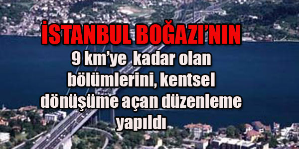 Tasarıdason dakika önergesiyle Boğaziçi Kanunu’na atıf yapılarak, Boğaziçi de kentsel dönüşüm kapsamına alındı. Önergede, “9. maddenin 2. fıkrasında (ı) bendinden sonra gelmek üzere (i) bendi olarak; ‘Geri görünüm ve etkilenme bölgeleri bakımında 18.11.1983 tarihli ve 2960 sayılı Boğaziçi Kanunu’nun’  ibaresinin eklenmesi” ifadesi yer aldı. Değişikliğin gerekçesi ise “boğaziçi kanunu kapsamında kalan geri görünüm ve etkilenme bölgelerinde kalan alanlarda da kanunun uygulanabilmesi amacıyla bu değişiklik yapılmıştır” şeklinde açıklandı.
