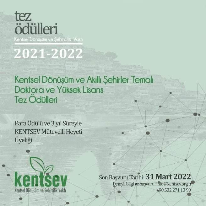 Kentsel Dönüşüm ve Şehircilik Vakfı (KENTSEV) tarafından; kentsel dönüşüm ve akıllı şehir çalışma alanlarını konu alan yüksek lisans ve doktora tezlerinin akademi ve uygulama alanlarındaki bilimsel, teknolojik, sosyal ve kültürel katkılarını en üst seviyeye çıkararak “Kentsel Dönüşüm ve Akıllı Şehirler” konusundaki farkındalık ve kaliteyi sağlamayı amaçlayan En Başarılı ve Uyarlanabilir Kentsel Dönüşüm ve Akıllı Şehirler Yüksek Lisans ve Doktora Tezi ödülleri için başlayan başvurular 31 mart tarihine kadar devam edecek.