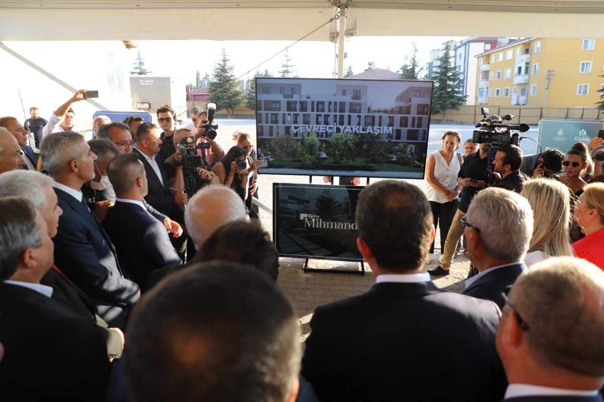 “3 bin 800 metrekarelik bir alan. Yaklaşık 1 ay önce belediyemizden ihale yoluyla satın aldık. ‘4 kapı 40 makam’ öğretisinden de yola çıkarak, projemizi avluya açılan dört tane büyük kapıyla tasarladık. Kırk makamı temsilen, dört bir tarafını farklı boyutlardaki kemerlerle dönerek, buranın kültürel değerlerini de projemize yansıtmak istedik, ki gelecekteki şehircilik anlayışımızı, bakış açımızı göstermek için. KİPTAŞ, yeni dönemde yaptığı tüm projelerde çevre odaklı projeler yapıyor. Burada, gri su kazanım sistemi ve güneş enerji panellerini kullanarak, tamamen çevreci bir proje hayata geçirdik. Projemizde tamamen bölgeden çıkan doğal taşlarla çevre mantolamasını yapacağız. Avlu kısmını etkinliklere, toplu yemeklere ve toplu bazı etkinliklere imkan sağlayacak şekilde tasarladık. 300 kişilik bir kapasitesi var. Tamamen modüler bir proje yaptık ve burayı 7/24 yaşayacak bir proje olarak tasarladık. Amacımız; bu kültürel değeri modern mimariyle birleştirip bir farkındalık yaratmak ve Anadolu’da örnek rol model olmak istedik. Proje zemin, artı 4 kat olacak. Yoğunluğun yüzde 25’ini kullanmıyoruz. Buraya ticari bir kaygıyla girmedik. Mevcut inşaat alanından daha az bir inşaat alanı yaparak, örnek bir mimari, çevreci bir proje hayata geçirmeyi arzu ettik.”